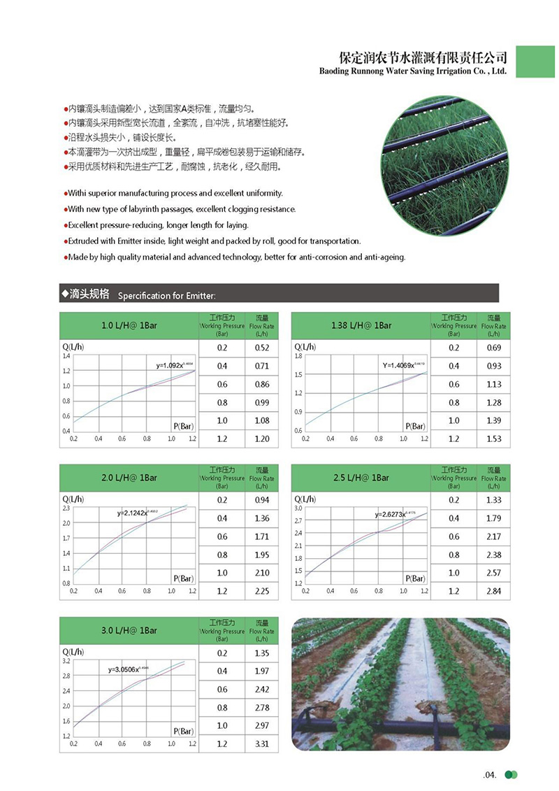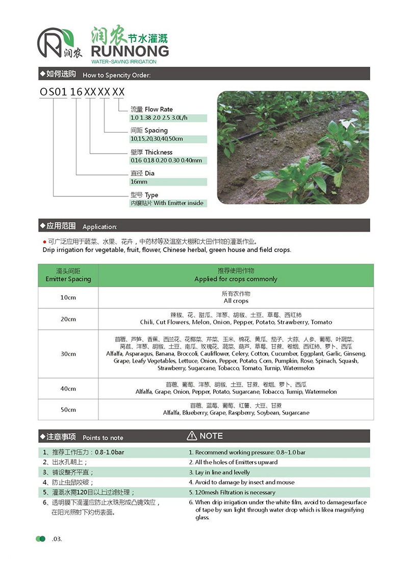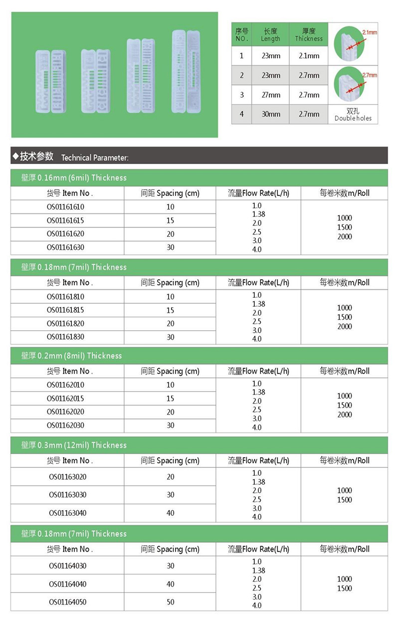 貼片式滴灌帶是利用塑料軟管(滴灌管)道將水通過直徑約16mm毛管上的孔口或滴頭送到作物根部進行局部灌溉。是通過出流孔口非常小入的滴頭或滴灌帶,把水一滴一滴地均勻而緩慢地滴在作物根部附近的土壤中。...